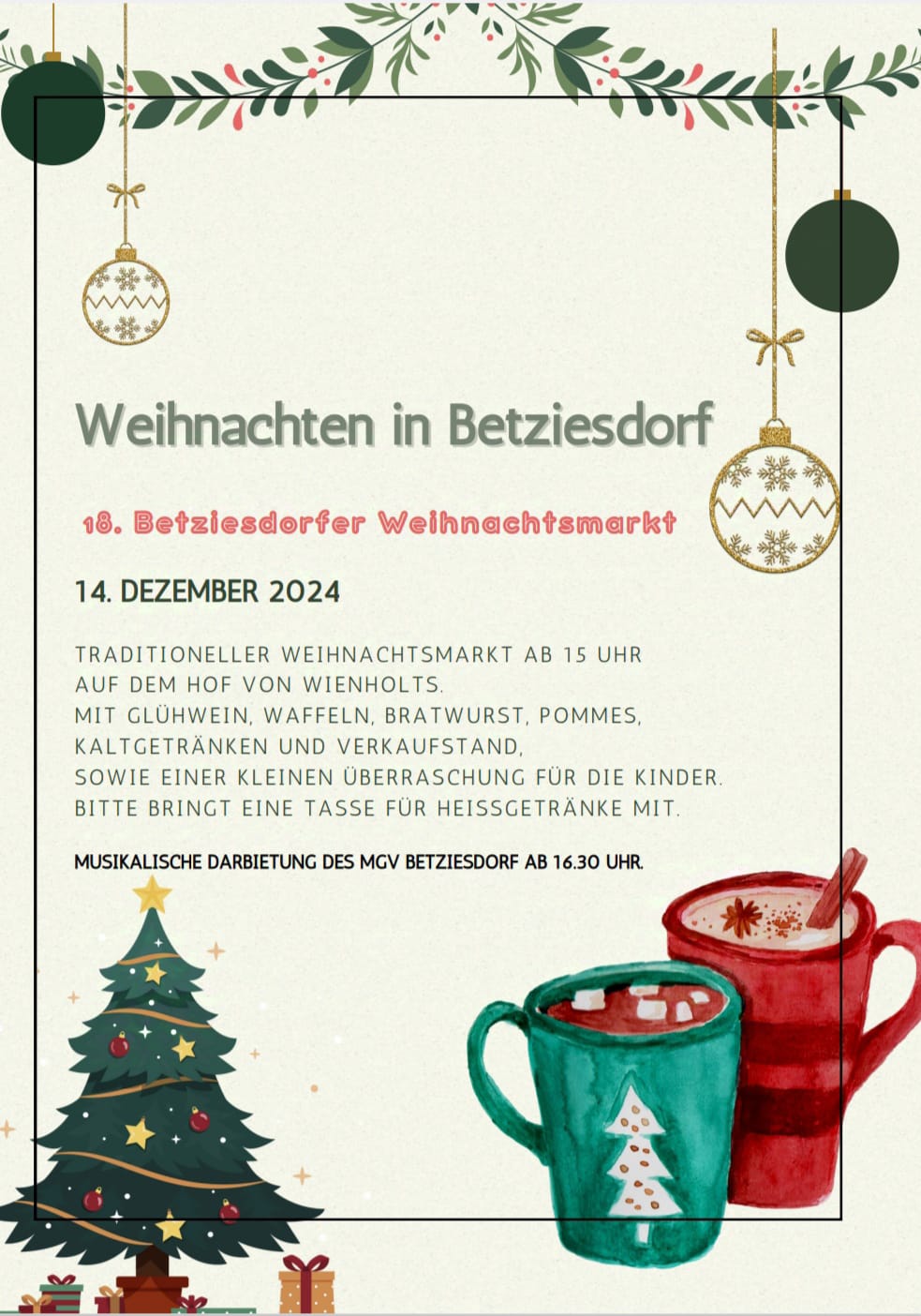 « Alle Veranstaltungen Diese Veranstaltung hat bereits stattgefunden. Betziesdorfer Weihnachtsmarkt 14. Dezember 2024 ab 15:00 « After-Work-Glühwein am Multifunktionalen Haus Öffentliche Sitzung des Ortsbeirates Betziesdorf » Zum Kalender hinzufügen Google Kalender iCalendar Outlook 365 Outlook Live Details Datum: 14. Dezember 2024 Zeit: 15:00 Veranstaltungsort Wienholt`s Hof, Lahnstrasse 13 Veranstalter Vereins-/ Dorfgemeinschaft