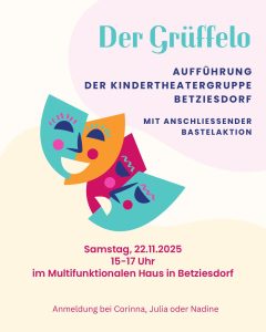 « Alle Veranstaltungen Der Grüffelo – Aufführung der Kindertheatergruppe Betziesdorf 22. November ab 15:00 -17:00 « Weihnachts-Aktion Spaß + Spiel mit Kindern Totensonntag Gedenken/Singen » Zum Kalender hinzufügen Google Kalender iCalendar Outlook 365 Outlook Live Details Datum: 22. November Zeit: 15:00 -17:00 Veranstaltungsort Multifunktionales Haus Betziesdorf