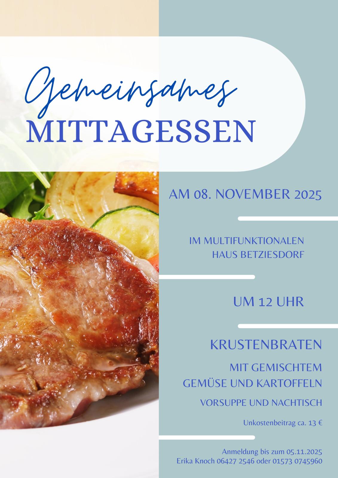 « Alle Veranstaltungen Diese Veranstaltung hat bereits stattgefunden. Gemeinsames Mittagessen 8. November 2025 ab 12:00 « 775 Jahre Betziesdorf im Jahr 2029 Laternenfest des Ev Kita Sternchen » Zum Kalender hinzufügen Google Kalender iCalendar Outlook 365 Outlook Live Details Datum: 8. November 2025 Zeit: 12:00 Veranstaltungsort Multifunktionales Haus Betziesdorf