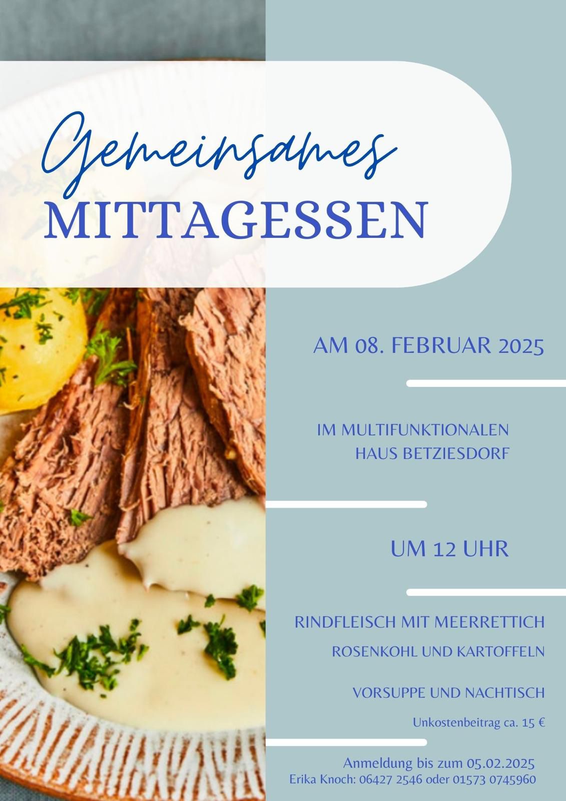 « Alle Veranstaltungen Diese Veranstaltung hat bereits stattgefunden. Gemeinsames Mittagessen 8. Februar 2025 ab 12:00 « Jahreshauptversammlung Folklore Gruppe Betziesdorf Cafe Kneifzange » Zum Kalender hinzufügen Google Kalender iCalendar Outlook 365 Outlook Live Details Datum: 8. Februar 2025 Zeit: 12:00 Veranstaltungsort Multifunktionales Haus Betziesdorf