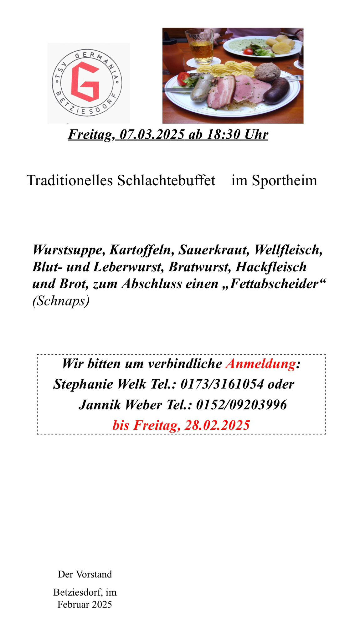 « Alle Veranstaltungen Diese Veranstaltung hat bereits stattgefunden. Schlachte Essen beim TSV 7. März 2025 ab 18:30 « Öffentliche Sitzung des Ortsbeirates Betziesdorf Second Hand Basar » Zum Kalender hinzufügen Google Kalender iCalendar Outlook 365 Outlook Live Details Datum: 7. März 2025 Zeit: 18:30 Veranstaltungsort Sportheim Veranstalter TSV Germania Betziesdorf