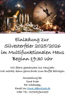 « Alle Veranstaltungen Silvesterfeier im Multifunktionalen Haus 31. Dezember ab 19:30 « Würfelabend Platt schwätze in Betziesdorf – Thema: Dorfnamen in Betziesdorf » Zum Kalender hinzufügen Google Kalender iCalendar Outlook 365 Outlook Live Details Datum: 31. Dezember Zeit: 19:30 Veranstaltungsort Multifunktionales Haus Betziesdorf