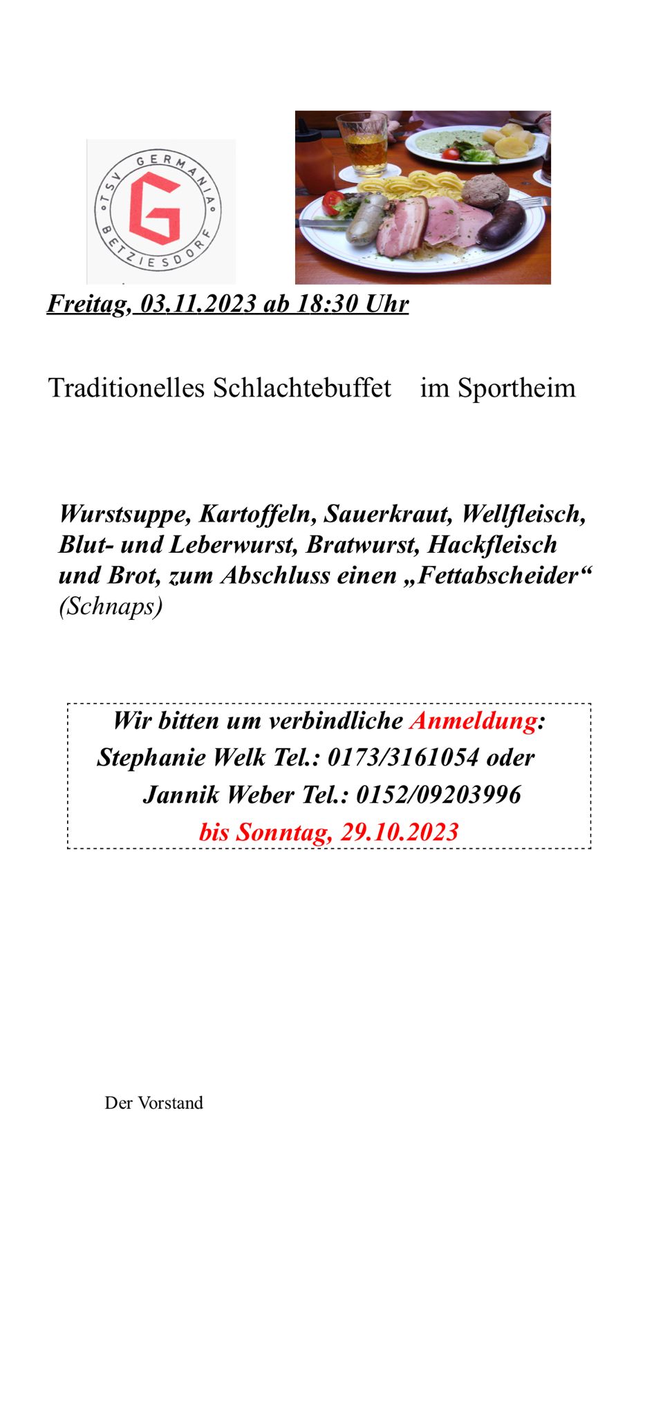 « Alle Veranstaltungen Diese Veranstaltung hat bereits stattgefunden. Traditionelles Schlachtebuffet im Sportheim 3. November 2023 ab 18:30 -23:30 « Sitzung der Lenkungsgruppe Multifunktionale Haus Betziesdorf Vorlese-Tag im Multifunktionalen Haus » Zum Kalender hinzufügen Google Kalender iCalendar Outlook 365 Outlook Live Details Datum: 3. November 2023 Zeit: 18:30 -23:30 Veranstaltungsort Sportheim Veranstalter TSV Germania Betziesdorf